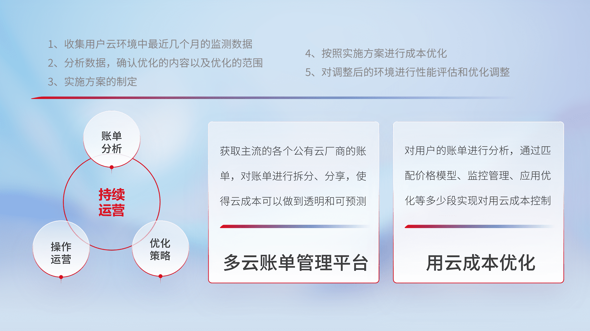 通过多云纳管,,以统一的资源数据模型把客户的云资源进行抽象和封装,,,,进而实现对多云资源的统一操作,,保障云资源管理的可靠性、、、稳定性与可用性。。。量身定制化运维内容,,配置、、开发运维、、、补丁管理、、备份、、、监控、、、认证和访问管理、、、审计和日常巡检等,,,,保障在用云过程中的可靠度,,稳定度以及高可用率。。